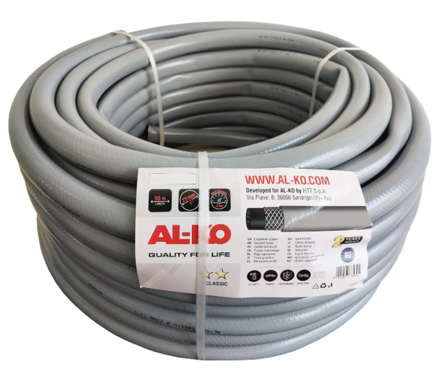 Тришаровий садовий шланг, зовнішній шар із захистом від стирання та ультрафіолетового випромінювання, текстильне перехресне армування, матеріал внутрішнього шару запобігає утворенню водоростей. Витримує робочий тиск - 8 Бар. Температурний режим від - 10 до + 40 °С, не містить шкідливих речовин (кадмію і барію). Зберігає форму, має легку вагу, матеріал - вініл.